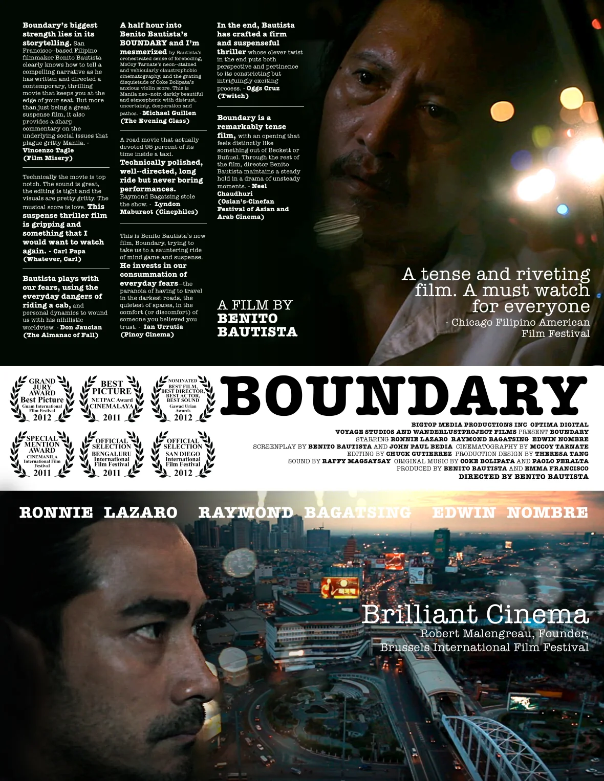 It’s only a few days before Christmas in Manila and struggling cab driver Limuel needs to reach his boundary (quota of customers) by the end of the night. He picks up a wealthy-looking, generous business man trying to make his way to Antipolo. But Limuel has a plan for his naïve and unsuspecting customer – a plan that he is none too proud to carry out. Things suddenly go beyond Limuel’s control as he himself is thrown from the wheel to the helpless backseat of a plot bigger than he ever expected.